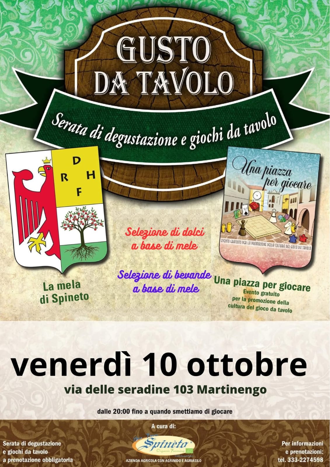 La serata sarà all’insegna delle mele: bevande e dolci a base di mele di Soc. Agr. Bio Farm Spineto s.s. e giochi da tavolo a base di mele!