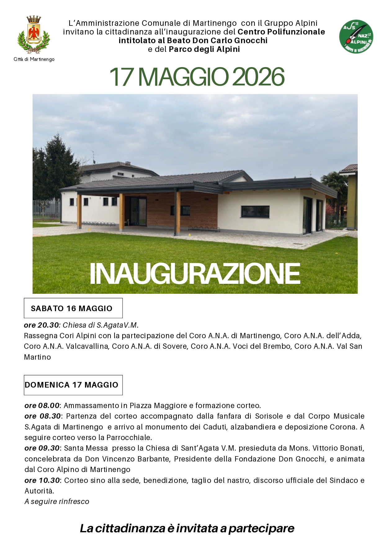 Domenica 17 Maggio 2026, a partire dalle ore 08:00, si terrà l’inaugurazione del Centro Polifunzionale intitolato al Beato Don Carlo Gnocchi e del Parco degli Alpini.